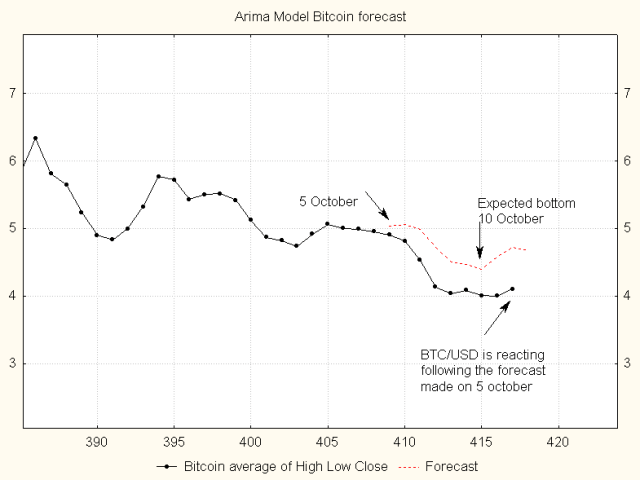Compared to the forecast the BTC/USD fell more then expected partially due to a large player that dumped 30k bitcoins on 7 October.