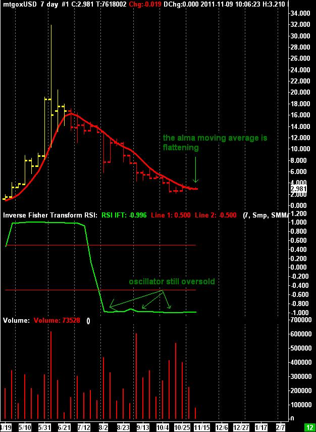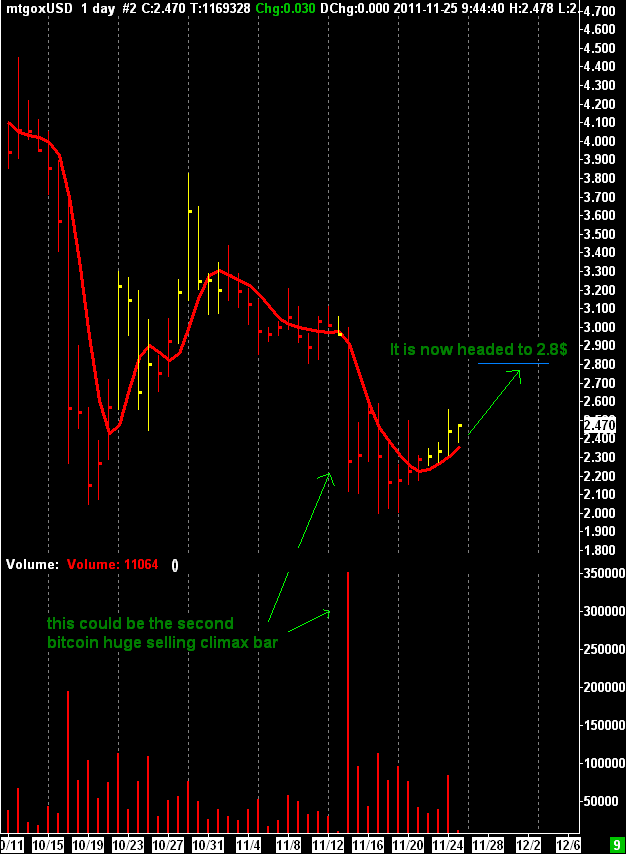 Initially i thought about a break down of the 2$ big support, but BTC/USD after a huge selling climax bar reacted to 2.47$, i now have to reassess my view giving 2.8$ as next target. Usually when a big downside bar develops its starting point become resistance and in this case the resistance is the 2.8$-3$ zone.