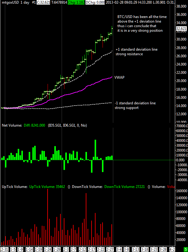 Btc/usd at the moment is drifting up following the +2 deviation line (not plotted in the attached chart) and it is very bullish. A good entry point could be a drop to the +1 deviation line at ~27$.