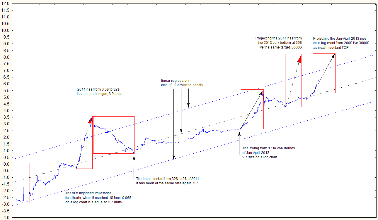 It may be noted that the next top might reach the $3600 price level, just above the current forecast that gives us the second deviation line of the linear regression, a perfect top in a buying climax situation which usually creates the market condition for a rapid fall in the price. At the moment to enter “bubble territory” we need to go above the 1100-1200$ price zone, just above the upper deviation line i’ve plotted on the chart. It is interesting also to note that the April 2013 top at 266$ has been under the upper deviation line while the 2011 top at 32$ has been well above and a true bubble which was followed by a bear market that has brought prices down to $ 2 in November 2011.