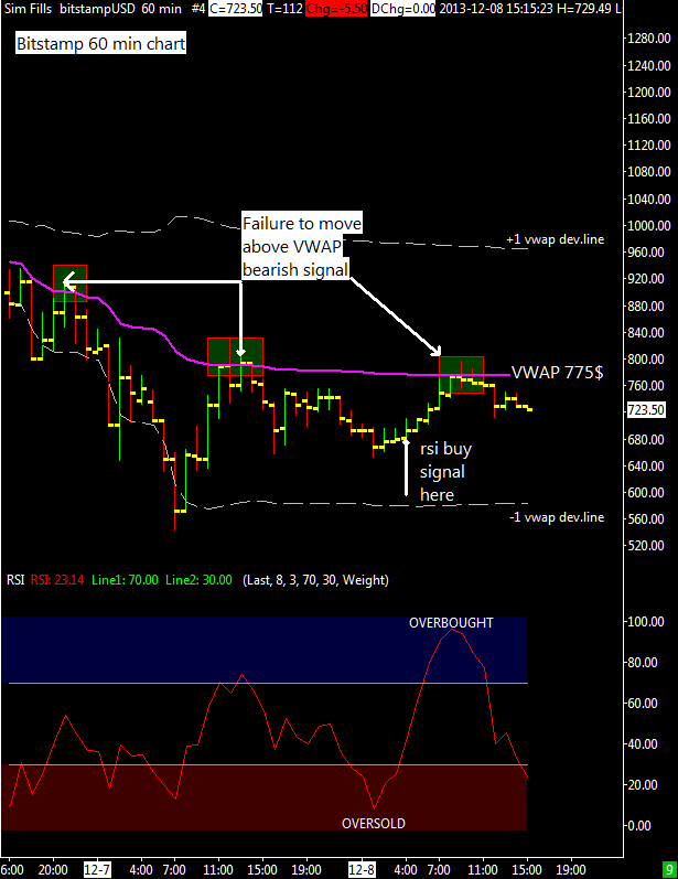 Considering the high level of volatility the distance between the lines increased so in these cases you can consider an intermediate level between VWAP and first deviation line (not plotted on the attached chart but it is around $670) . So having good price and time indications it was wise to take the trade at around 680$ and it’s preferable to maximize the trade outcome closing it when a resistance is met (the vwap) and when rsi is overbought. Both conditions happened later and this trading opportunity has been a very clean one; very often these market movements are very smooth and natural.