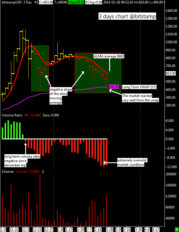 About volume activity the “volume ratio” indicator tell us that the situation is still very oversold and all the recent bearish news and the excess of pessimism among many investors let me think that probably the bottom is in but to avoid any risk before opening a long position is wise to wait a positive volume activity that should be back once a new uptrend is established and confirmed by the reversal to the upside of the ALMA moving average i use.