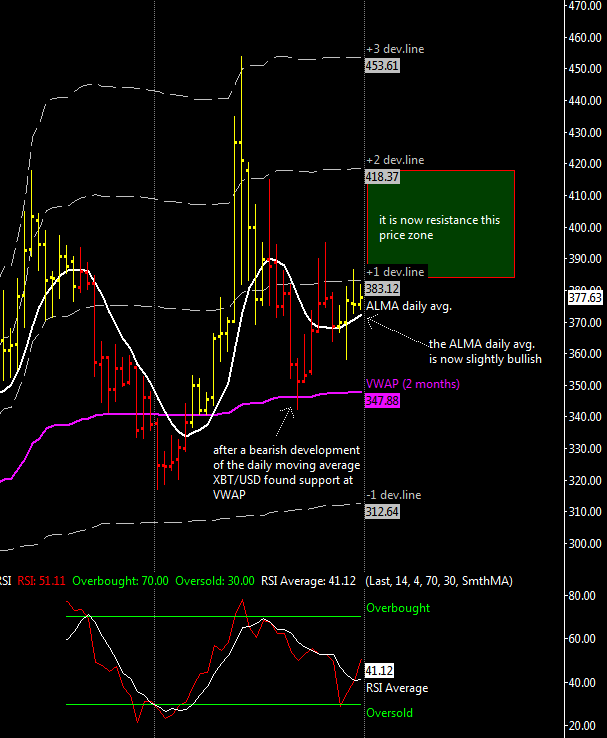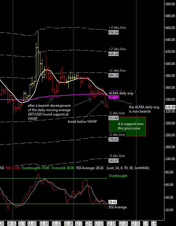 I indicated in the above chart a strong support area for the next 1-2 weeks, XBT/USD is now again bearish because XBT/USD took a peek below the 2 months VWAP support zone at ~350$. I think the market will spend most of its time today and the next days above or at $315 and if it does then the 316$ November low probably ended the drop from 463$ on November 13. Despite the prolonged correction seen in 2014 I see no sign that the very long term bull market has ended (bitcoin is well above the 2013 average price) and in any case I expect the XBT/USD to hold above its previous 2013 top at 266$.