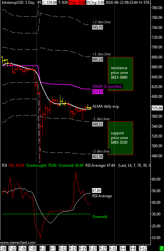 XBT/USD weekly range $ 550-$ 615 | ALMA daily moving average is still slightly bearish and the main resistance is unchanged at VWAP around $ 615.