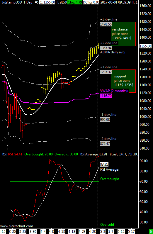 XBT / USD weekly price range is 1230$-1480$. | The XBTUSD pair begins to approach the resistances on both the daily and weekly charts (see previous update for weekly chart), but still remains in strong position above the VWAP now at 1116$.