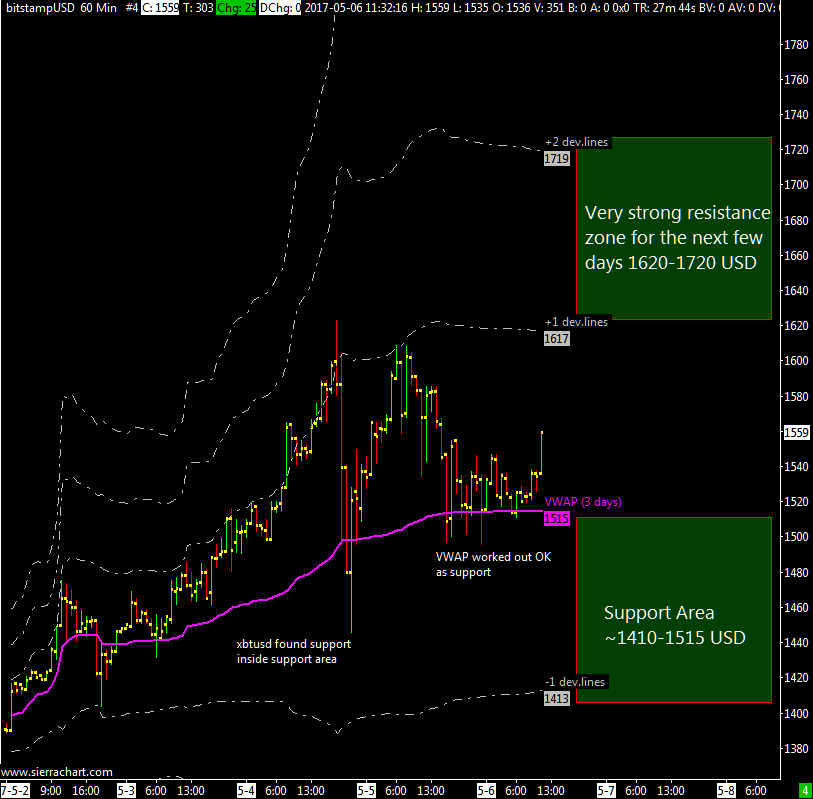XBTUSD failed to pass the first positive deviation line then a retracement back to VWAP where it consolidated a bit and now it’s reacting again to the upside.