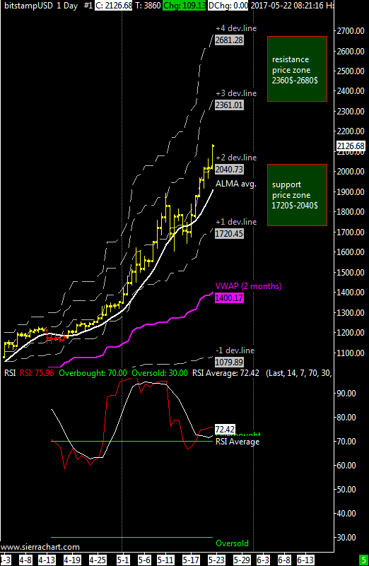 When a market is very strong it is possible that it moves between the first and second line of deviation that acts as support and resistance defining a price channel. At the moment XBTUSD is moving between the second and the third line and it does not happen very often and if you look the RSI you can see that it is oscillating between the overbought threshold (70) and the maximum value of 95-100, an extreme situation if compared to other financial assets.