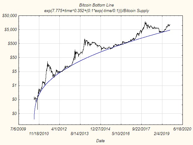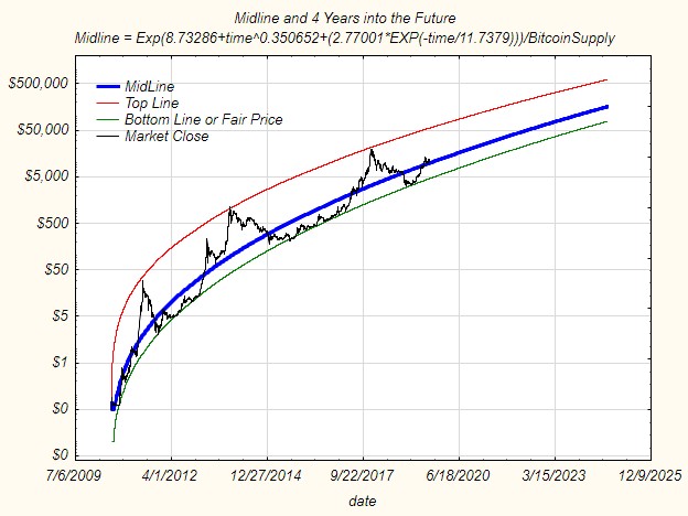 Bitcoin Top Line = Exp(12.1929+time^(0.337559)-1.74202*Exp(-time/2.35151))/Bitcoin Supply