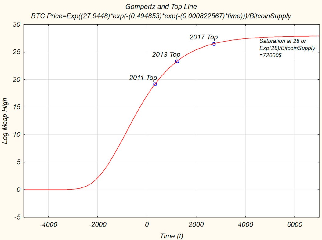 Benjamin Gompertz is the author of a sigmoid function which describes growth as being slowest at the start and end of a given time period and the future value asymptote of the function is approached more gradually by the curve than the left-hand or lower valued asymptote. I started this article talking about the importance of the user base as a way to simulate saturation because there is a limited number of users that limit the growth of a system, and now i conclude this article trying to model bitcoin price using the formula provided by Mr.Gompertz.